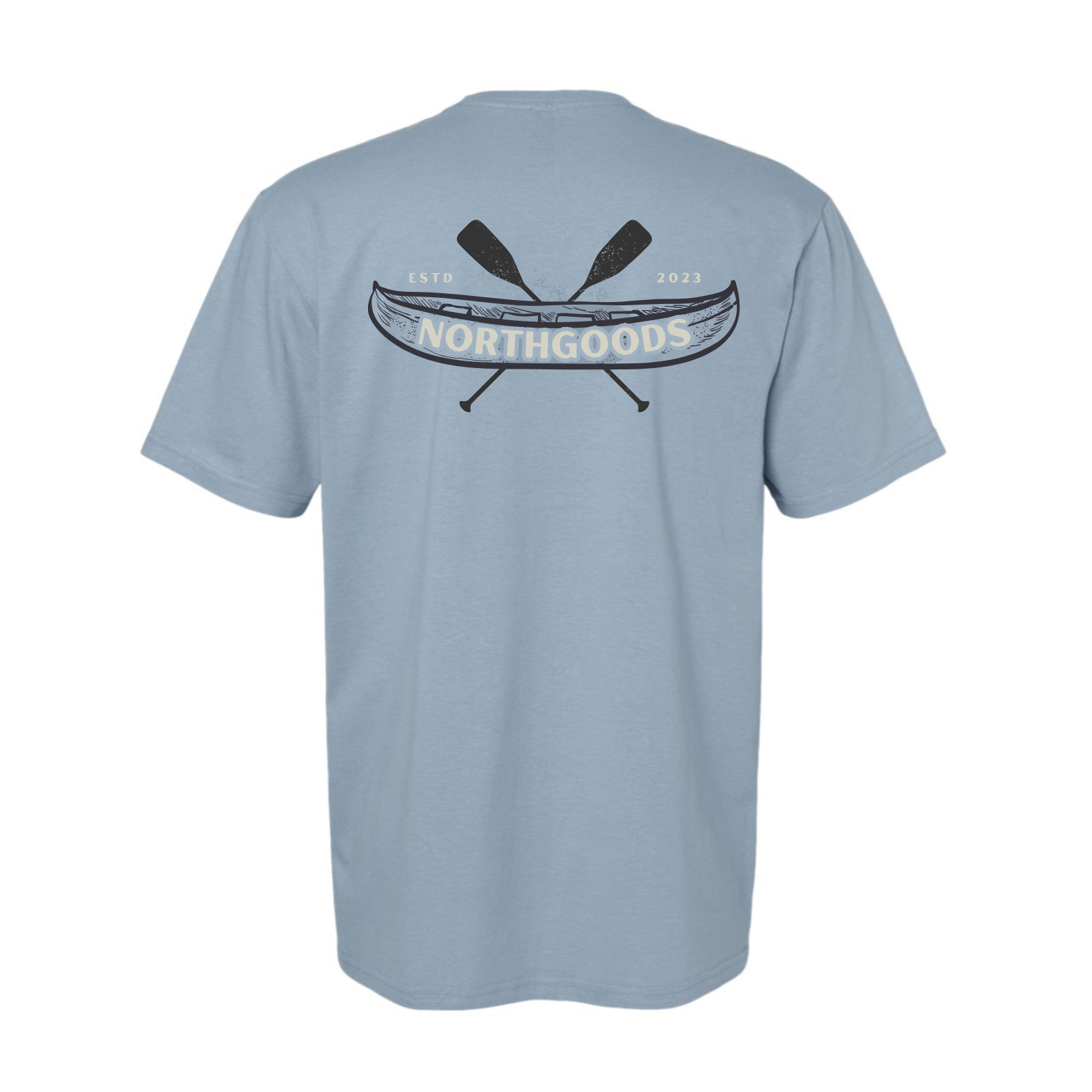 The Lake Paddle Unisex Tee features our Trees icon on the front left crest and the Lake Paddle canoe design on the back.