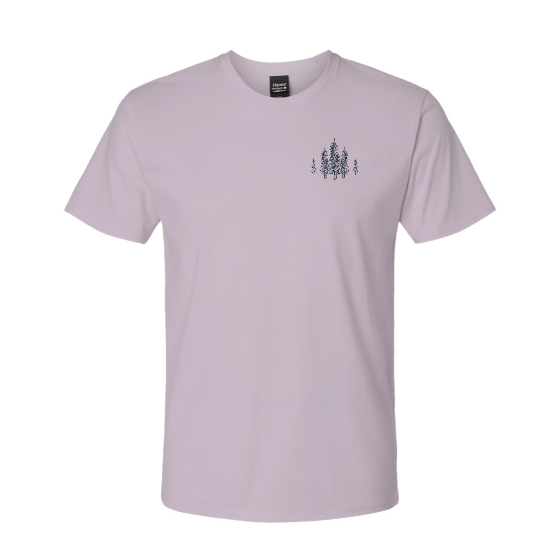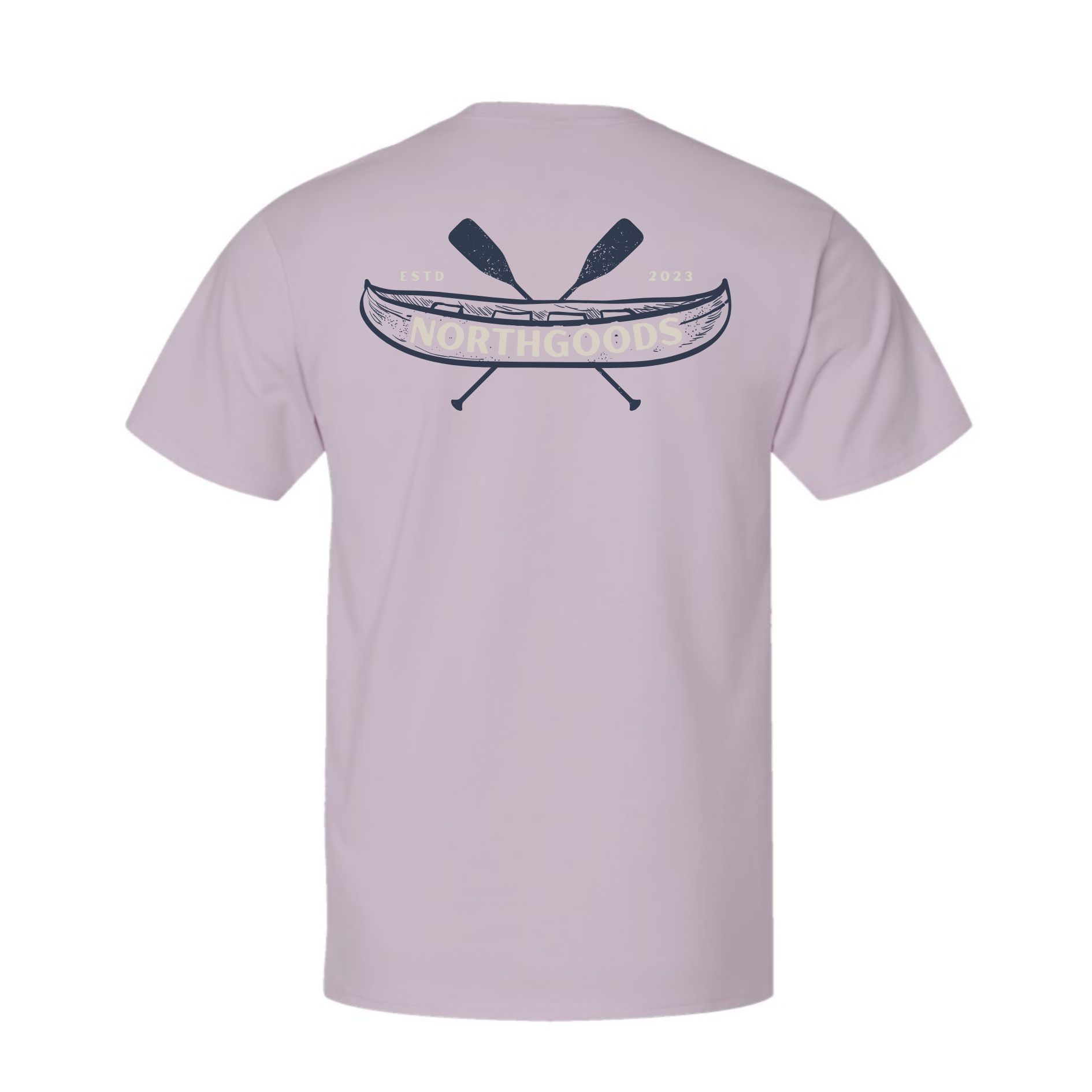 The Lake Paddle Unisex Tee features our Trees icon on the front left crest and the Lake Paddle canoe design on the back.