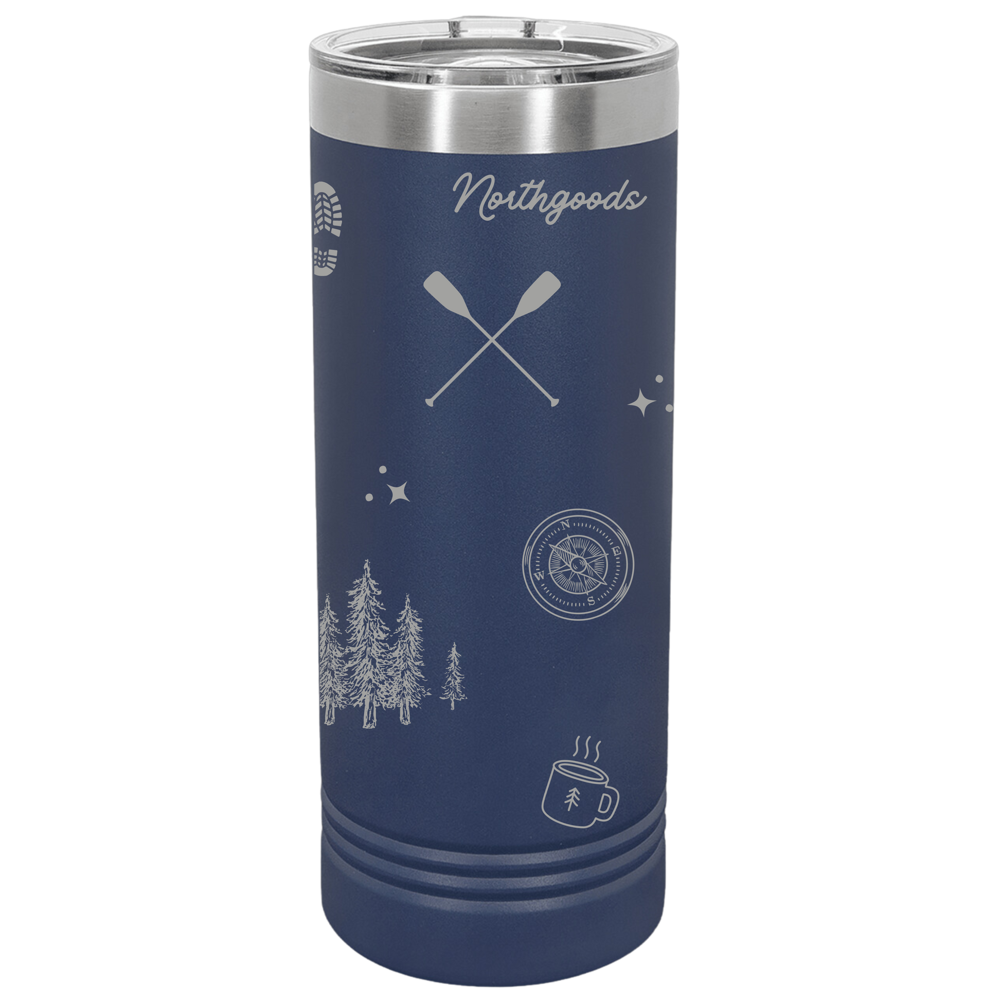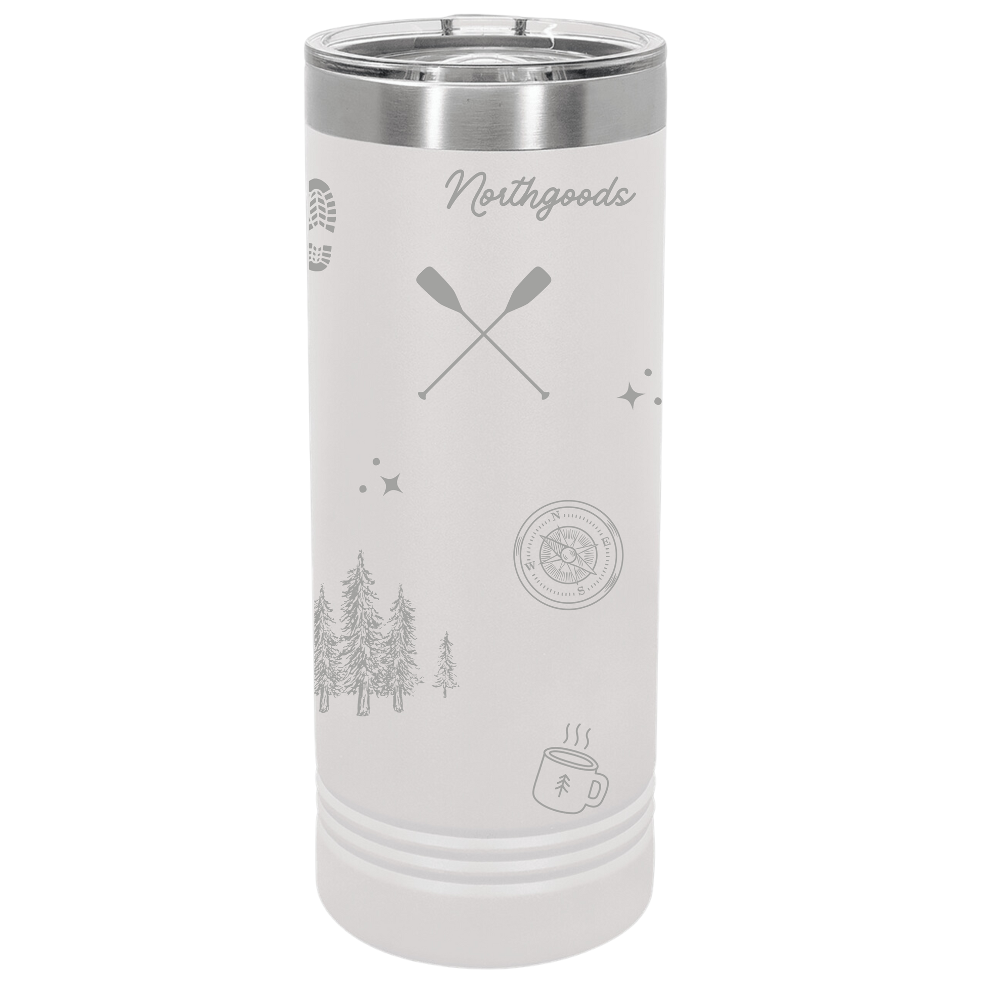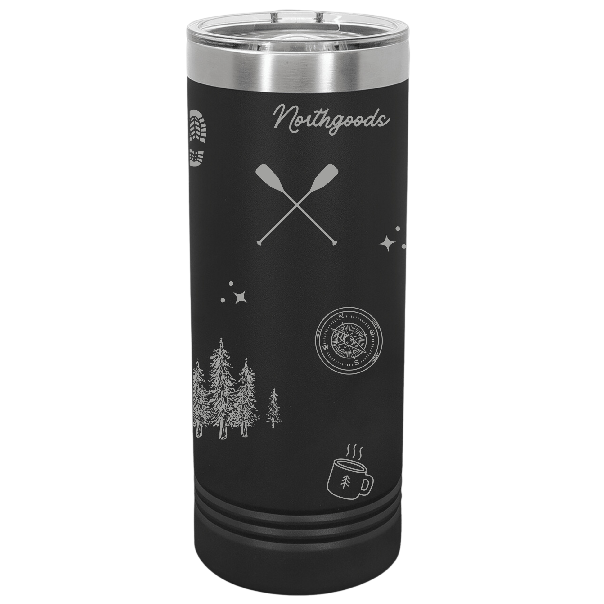 This Skinny Tumbler is etched to reveal the stainless underneath in our camp icons design. It fits perfectly in most cup holders and is double walled, vacuum insulated to keep you beverages hot or cold on any adventure.